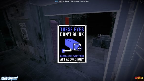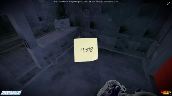切换到卫兵房间里的摄像头,点击电脑,可以找到“4318”的纸条,可能是某扇门的密码。
