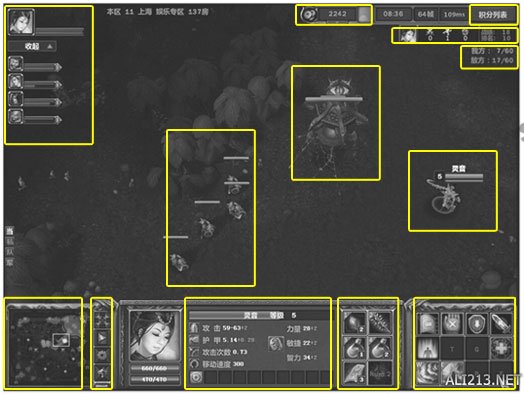 1、游戏界面(包含:英雄列表,小兵,防御塔,金钱,积分列表,个人、团队积分板,英雄,技能版,装备栏,属性栏,地图及信号)