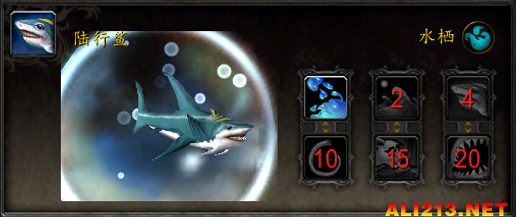 技能:1-水流喷射 2-潮汐之波 4-沐血 10-甩尾拍击 15-专注 20-囫囵吞食