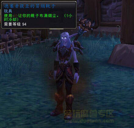 德赛普提亚的冒烟靴子(玩具):1小时CD,持续5分钟,让你的靴子冒出滚滚浓烟。这个玩具代表了一个悲哀的故事,当你远远的看到一个带着叹号的NPC,准备过去接任务的时候,一个钢铁星弹飞来,NPC只剩下这一双鞋。暴雪你太狠了……