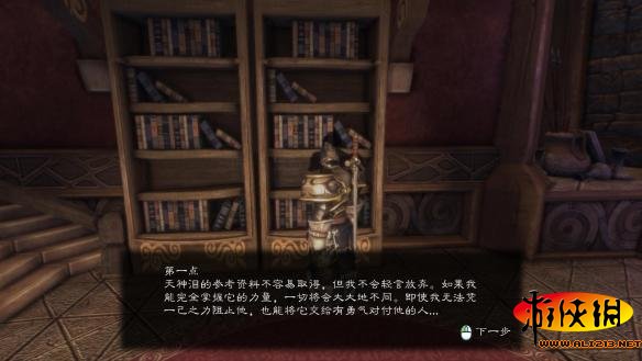 然后去梅兹的房间,调查楼梯右边的书柜,可以得到梅兹记载的天神泪线索。