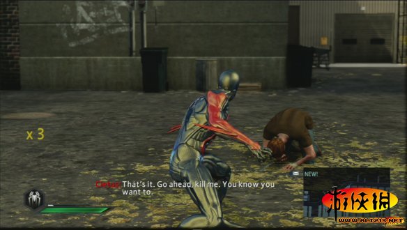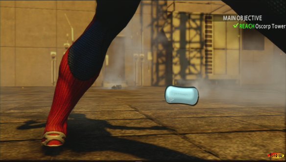 然后小伙伴们就准备去证据大楼去了,在这一章会遇到我们游戏中的第一个BOSS,然后蜘蛛人好像对此表示很惊喜的感觉,来到Raid on oscorp大厦,然后有土匪向你扔了两块肥皂,看你要不要捡啊。