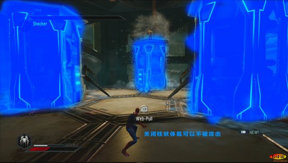 例如这个样子的一个机械,关闭需要花一点时间而且是有点长的那种。蜘蛛侠可以感应敌人的方位,所以在关闭前线感应一下,会比较好。关闭完成后,BOSS出现。