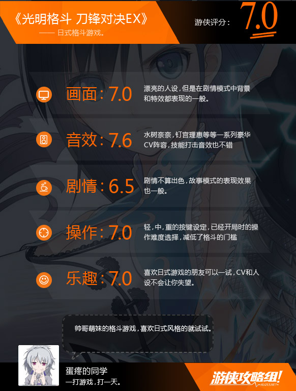 游戏在故事模式以及对战平衡上的表现都不算很好,但是漂亮的人设,豪华的CV阵容,依然是个可以用来朋友间娱乐的不错选择。