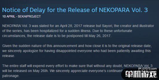 原定于4月28日发售的绅士游戏《巧克力与香子兰3》今天宣布延期,延期的原因是制作人SA姐突发急病,住院疗养。公告称本作会延期至5月26日发售。