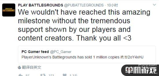 “如果没有玩家的支持,我们不可能走到这一步。非常感谢大家热情的反馈。后续我们会继续提高游戏体验,并不断增加新的内容,我们也会继续与玩家互动了解大家的需求。”游戏的制作人Brendan Greene(也就是PlayerUnknown)表示。