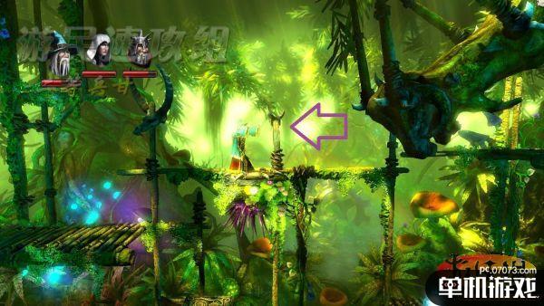 在平台上切换为法师用魔法控制这种如攻城锤一样的木桩,在木桩撞过来的一瞬间跳上去,之后可以取得左侧空中的经验瓶