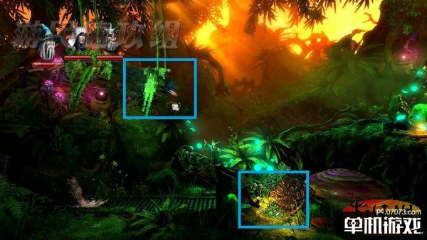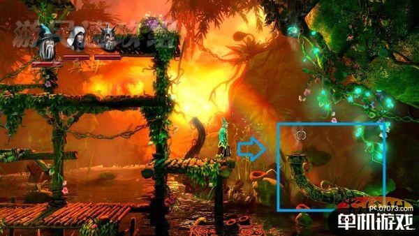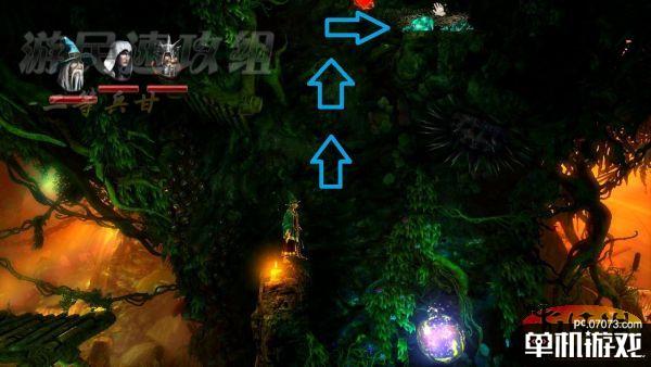 消灭这处场景内的敌人后使用法师利用魔法把蒸汽管道拼接好,站在蒸汽上取得半空中的经验瓶