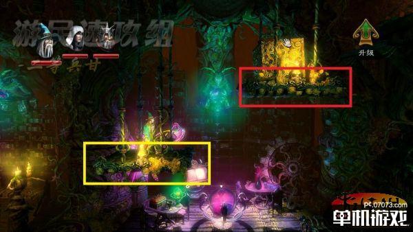 注意这两个平台很有意思:一个重了另一个人就会上升,反之也一样,我们要用魔法把箱子堆到右侧的平台上,在左侧平台上放一只箱子即可,之后我们跳到右侧平台,再把多余的箱子拿下来,这样左侧的平台落下来后就会把右侧的平台拉上去