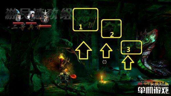 终于进行BOSS战了,这条斑斓大蟒就是BOSS,不要拿刀去砍,这货是无敌的,一口就能把你秒了,要切换为盗贼跳到场景内的三个平台上