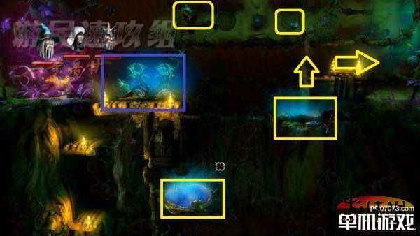 取得全部瓶子后,踩着右侧大锅冒出的气泡来到下一处平台,注意要先用法师在对面平台上制作一个落脚点,不然很难跳上去