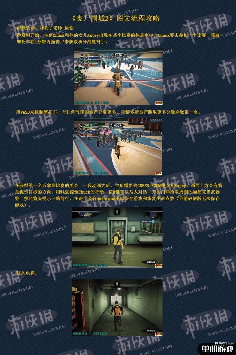游戏刚开始,主角Chuck和他的女儿Katey出现在某个比赛的休息室中。Chuck要去参加一个比赛,骑着摩托车在1分钟内撞丧尸来获取积分战胜对手。用WASD来控制摩托车,有红色气球的丧尸分数更多。尽量多撞丧尸赚取更多分数夺取第一名。在获得第一名后拿到比赛的奖金。一段动画之后,主角需要去GREEN ROOM找女儿Katey。画面上方会有箭头提示目标的方向。用WASD控制Chuck的行动,按E键可以与人对话,开关门和拾取周围的物品充当武器等。按照箭头提示一路前行,在路上会有bathroom用以保存游戏和恢复生命点数,进入电梯,电梯突然发生故障,Chuck从电梯出来后发现了众多的丧尸。主角需要去寻找Katey,地上会有很多物品可以利用作为武器,不过是有耐久度的