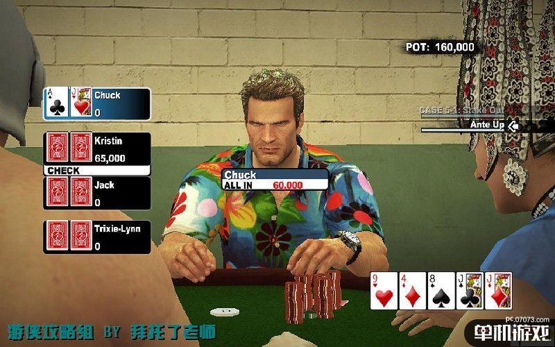 扑克的规则和简单,类似于梭哈,不过以手上的2张牌和台面上的5张牌加在一起计算。3个J,果断把钱全压上。对手没有赌资后会以身上的衣服、饰品等变卖补充金钱数,直至输到没东西可以当。每彻底赢光一个人的钱就会获得5000PP。