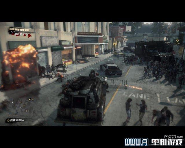 此时要面对多个开着摩托车的飞车党(他们会投掷燃烧弹),先在附近找来一辆车辆与摩托车对撞,就能轻松除掉摩托车手。