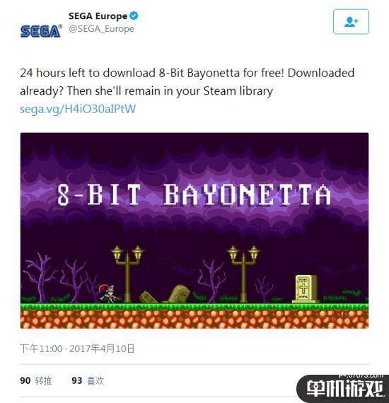 17个小时前,世嘉欧洲发布推文:“还有24个小时可以免费下载《8-bit 猎天使魔女》!你们下载了没?她将留存于你们的游戏库里。”经过笔者测试,目前这款游戏下载后删除依然不会给你的游戏库+1,所以这很能代表着《8-bit 猎天使魔女》会在世嘉发表推文的24小时后变成收费游戏,或者彻底消失,然后给你的游戏库喜+1。
