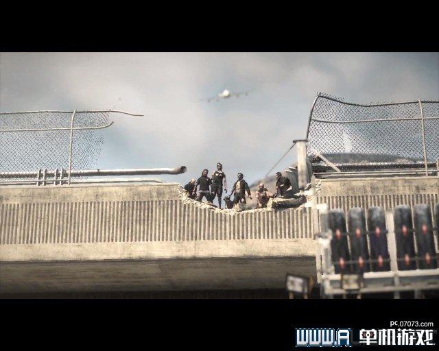 step8.在机舱另一侧出口会看见下方已经积聚了一大帮尸群,同样是利用街道上的车顶越过大批的丧尸进入到前方的隧道内。