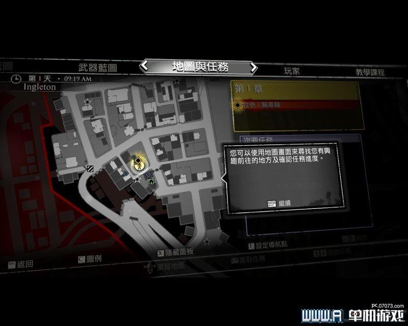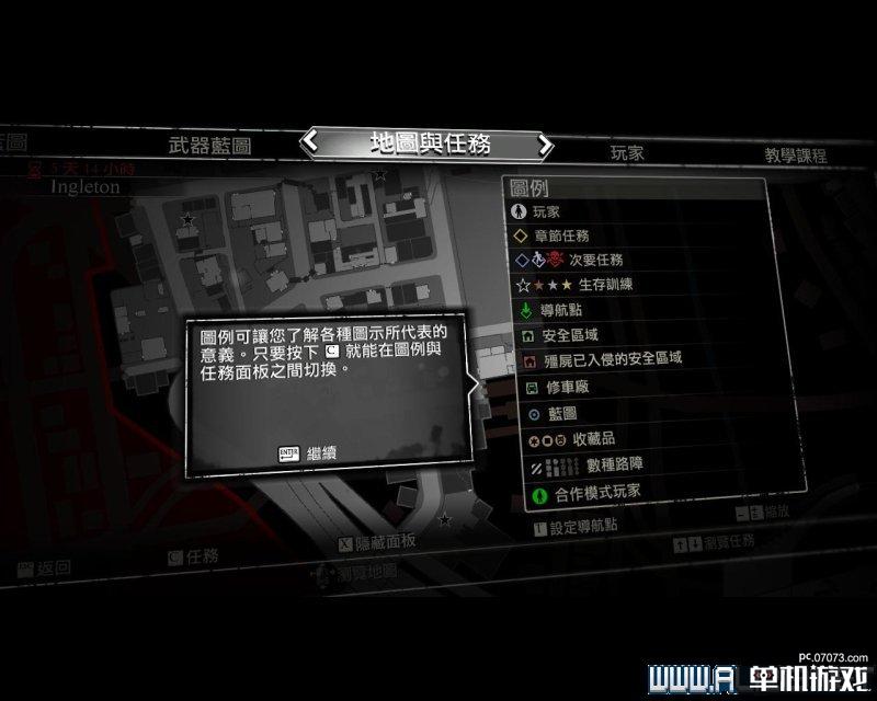 《丧尸围城3》分为了四大区域,英格尔顿(左上角)、南奥姆大(左下角)、日暮山(右上角)、中心城(右下角)。