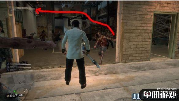 沿着厂房楼梯上到2楼后,从左侧的窗口跳到一个平台