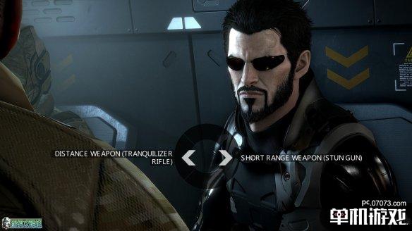 在飞机上,指挥官会让Jensen选择非致命潜入或者是强突进入。之后会让Jensen选择佩戴的武器是远距离武器(镇静剂)或者是短程武器(击晕枪)。这决定了之后的关卡中玩家的战斗策略,但可以任凭自己喜好选择。