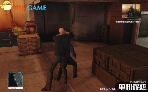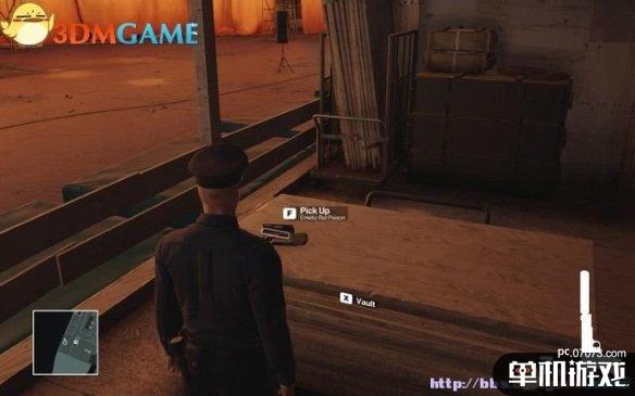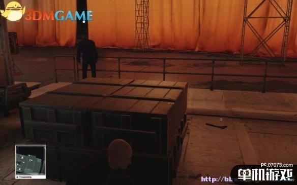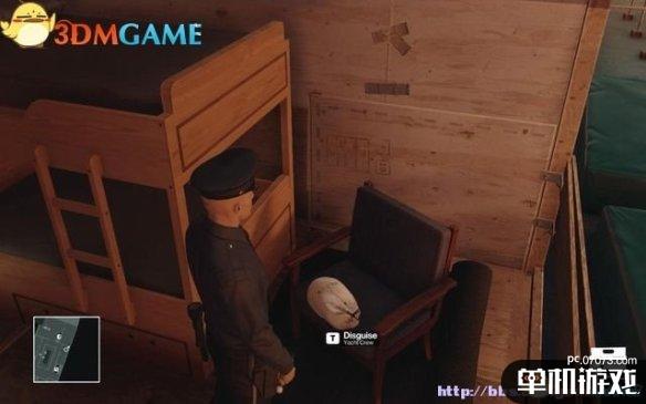 潜入0层甲板后,找到那个背对站着不动的警员,在图示位置放下一把手枪,然后躲在木箱后面。