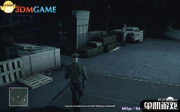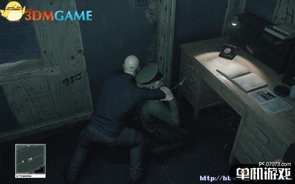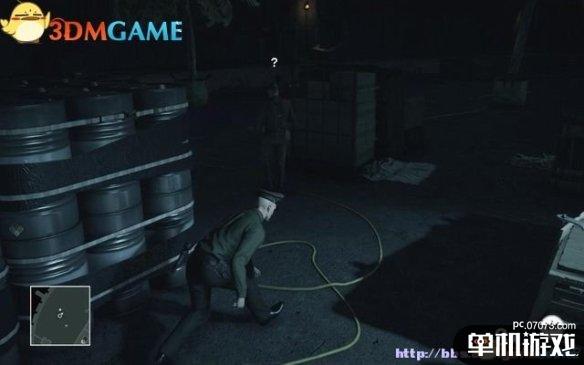 任务开始,由身后绕向基地正门的警卫室。警卫室里有名背对的警卫,而外面的门口还有一名警卫,朝着他身边的汽车位置扔硬币。