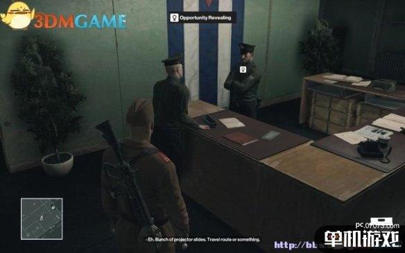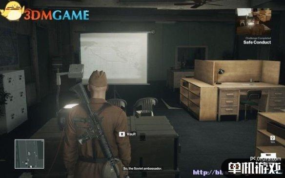 达成这项挑战需走电刑处死谋杀路线。首先伪装成苏联士兵,在1楼的办公区听两名警卫谈话,从桌上拾取红色文件夹(幻灯片)。