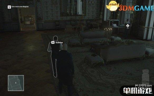 来到如图的房间,先放倒玩手机的服务生,再过去解决那名技师,换上房间。尸体不用藏,不发生警卫的话没人进来。