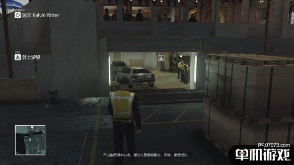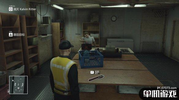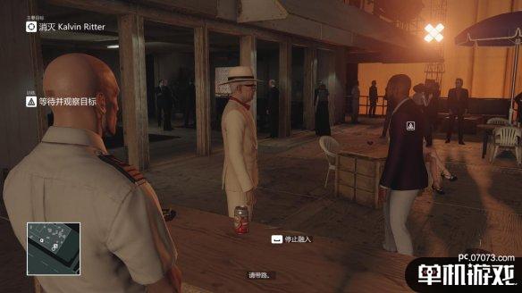 查看Kalvin Ritter(按Ctrl)的位置,穿着水手服,到目标旁边的桌子上进行相关工作(按E),这样就能避免被Kalvin Ritter发现。等待Ritter与身旁的女子对话完毕后,会有一名头戴白帽的男子前来交谈。