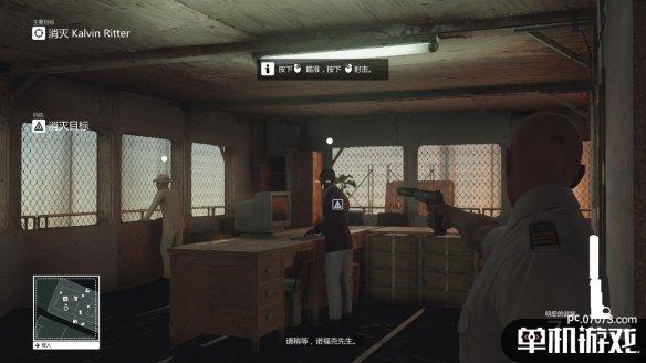 贴着墙壁(按空格),切换出消音手枪,等待Ritter说道:“请稍等,诺福克先生”时,即可一枪爆头,此时的诺福克正在看向窗外,倒下的Ritter会被桌子挡住,诺福克会离开房间。