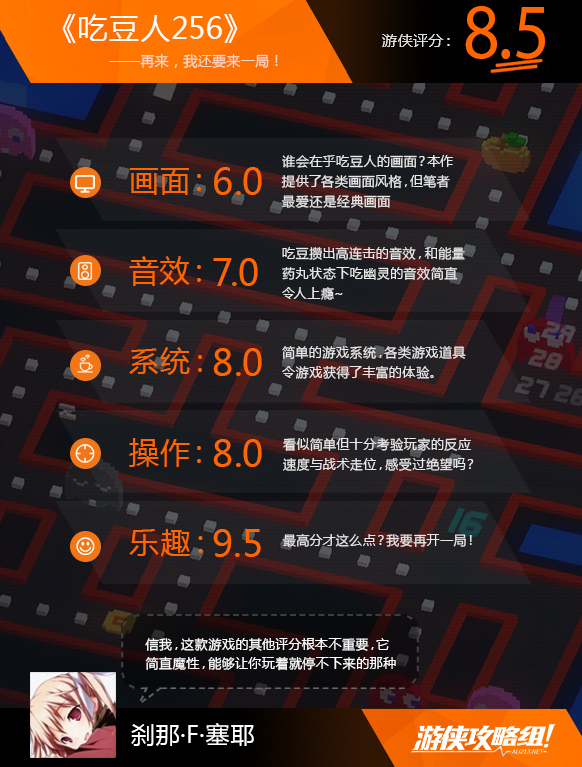 游戏的乐趣多种多样,有些游戏设计了宏大的场景、动人的剧情和细腻的贴图,力求给玩家带来一个第二世界;而《吃豆人256》则毫无疑问是那种你刚刚认识到“游戏”时的简单却能够轻易让你快乐的游戏。而且跟很多游戏一样,在《吃豆人256》的世界里,运气也占了很大的比重,你很可能在绝境之中突然遇到一个刚好刷新在眼前的道具,然后顺势疯狂的吃了一波,分数从几K暴涨到近万。相信我,这一刻会让你爽到不行。而与各类幽灵斗智斗勇孤身周旋最后成功逃脱死局的场景,也总是能让人乐在其中。闲暇时来上几局,心满意足的关闭游戏,心情也好了几分。这也许就是游戏最开始存在的意义吧。这样一款游戏,又让人有什么理由不去爱它?