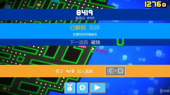 说到道具,本作的道具不可谓不多,在地图中玩家能够获得“能量药丸”这一类超级道具,得到该道具后,一段时间内玩家处于无敌,并且可以吞噬化为蓝色幽灵的敌人并且叠加得分,每吞噬一个敌人还能够短暂的延长道具有效时间,无疑是刷分利器。而除了能量药丸,玩家还可以根据自己的喜好自由搭配三个道具选择,被选择的三个道具将会随机出现在地图上。值得一提的是,本作的道具总数有21个,但除了开场的三个道具之外,其他的道具都是需要玩家花费游戏时间来解锁的。