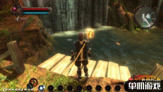 出了洞窟,左边有一个台阶跳下后,湖泊的旋涡中有物品可以捡,瀑布的水帘之后有三宝箱。一个魔法陷阱宝箱与两个被锁住的宝箱。