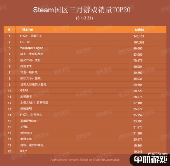 位列3月国区销量第一的是《H1Z1》,不太出乎意料,这款游戏自从被炒起来之后热度仍然没有下降的趋势。本月售出34万份。