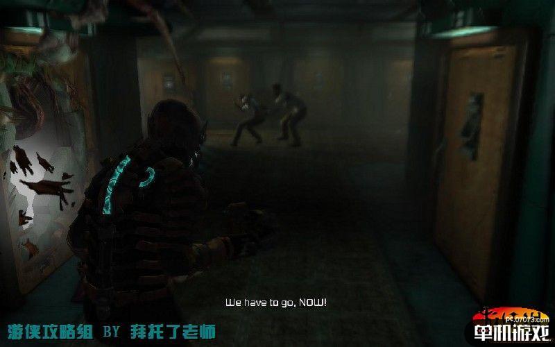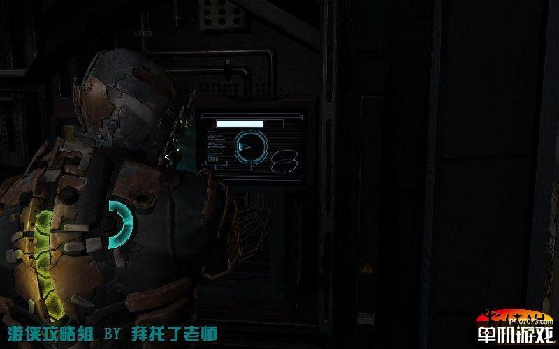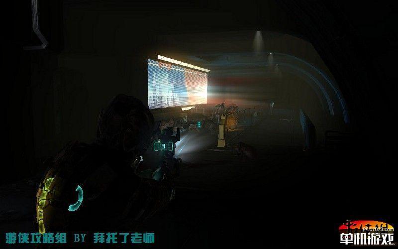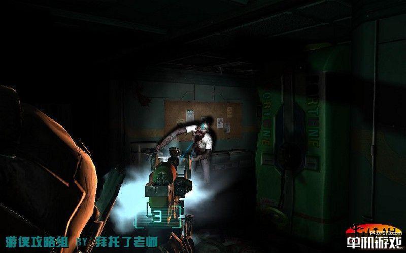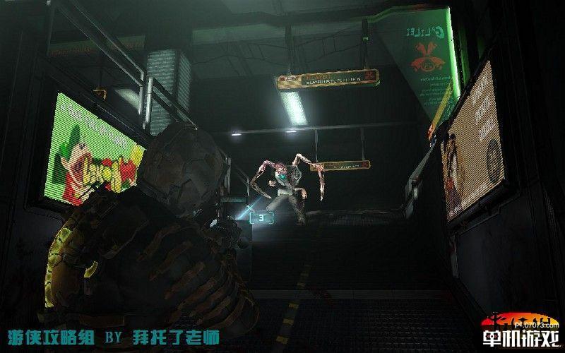 沿着通道穿过大门,进入电梯。使用电梯后,电梯会在中途停住,有人向Isaac求救,但还是被怪物杀掉了。从电梯里面出来,会有影像传来。主角没走几步,地上诈尸的怪物就会起来突袭主角。猛按E键摆脱攻击并干掉它。后面也会有几个怪物会诈尸,要特别小心。