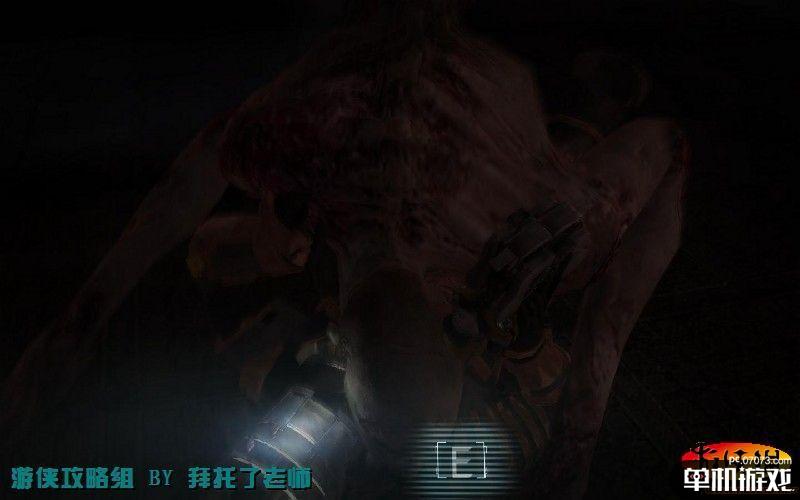 改掉房间里面的怪物后,穿过几道门进入一个漆黑的房间,按右键用武器上的灯光照明。干掉里面的怪物后,房间会变亮,并且可以继续前进了。