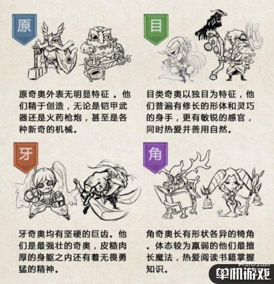在实际设定集中,奇奥共分为四大类,他们分别为原奇奥、目奇奥、牙奇奥与角奇奥,他们天赋各异并有着自己种族独有的特色,玩家将各自为阵使用诸多附有种族特色的英雄与卡牌进行对战。
