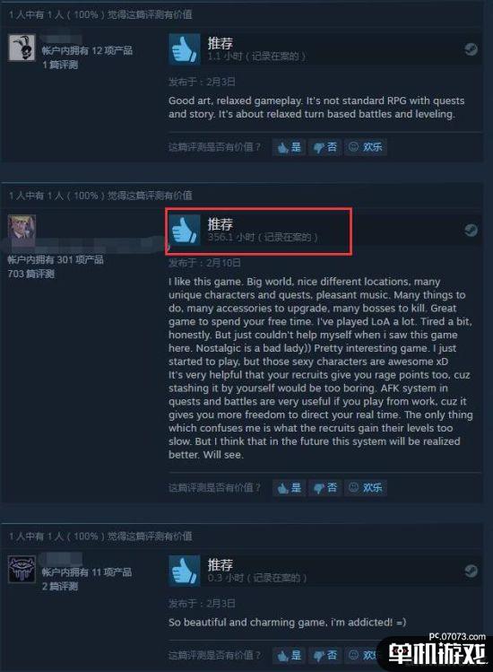 这款游戏画风和玩法都很类似“一刀9999999级”、“屠龙宝刀点击就送”一类的传统国产页游,不过老外们对于这款游戏倒还挺买账。从Steam页面上看,给出好评的外国友人还真不少,其中一个甚至还玩了356个小时,他称赞这款游戏很有趣:世界广阔,场景丰富,还有很多独特角色和任务,音乐也很悦耳。还有一些外国玩家称赞游戏画风优美,玩起来很休闲等等...
