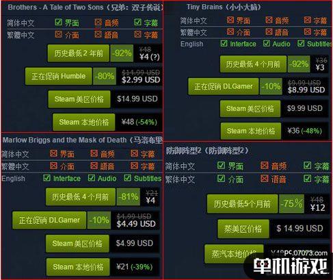 同时值得一提的是《兄弟:双子故事》、《防御阵型2》两款游戏均官方均有中文支持。