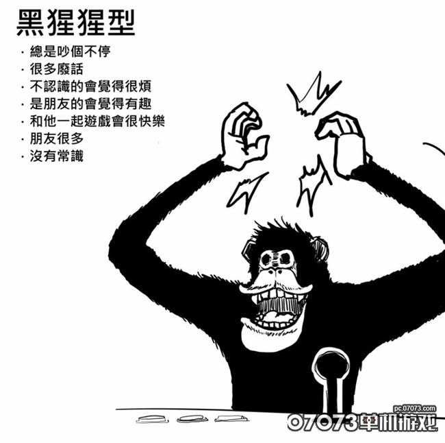 提起黑猩猩我们脑中总会出现猩猩左右摇摆拍手大叫的情形,因此这类型玩家基本都是一大群人扎堆打游戏,并且情绪外露丝毫不加掩饰,哈哈大笑互损唠叨更是常事,总之这类型玩家聚在一起总会充满欢乐,只是要小心别因为过度吵闹而被赶出网咖大门哟。