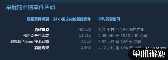 从今天的截图来看,24小时之内新的退款申请为48798,前两天则为49119,基本都是接近5万条申请。其他的申请类型诸如账户安全与恢复、游戏与Steam技术问题、消费购买等都比退款申请少得多。