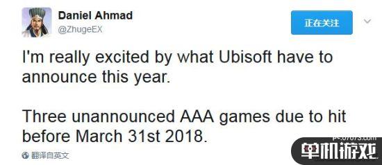 今天游戏业界人士@ZhugeEX在Twitter上发文,称自己非常激动育碧将会在这个财年,也就是到2018年三月之前,公布哪三部全新3A大作。这让我们想起,育碧曾经在2月份的财报中提到,2017财年将专注于新游戏的开发而不是推出旧IP的续作。