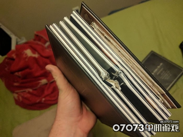 子弹停留在《上古卷轴3:晨风》那页,velorok本想给子弹也拍照分享,可惜警察在取证时将子弹带走,并没给velorok留下拍照的机会,至于邻居为什么想射杀velorok,事件还在调查中。