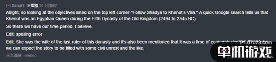 而Reddit上眼尖的网友还看清了另一行文字上所写的内容“跟着Shadya去Khneut的别墅”(Follow Shadya to Khenut's Villa)。而这位网友经过搜索之后发现,古埃及历史上就有这么一位名叫Khneut的王后。她是古埃及第五王朝最后一位法老王乌尼斯(Unas)的王后。而这位法老在位期间发生了一场战争和大饥馑,而后者更使古王国时代结束了黄金时代,开始衰落。