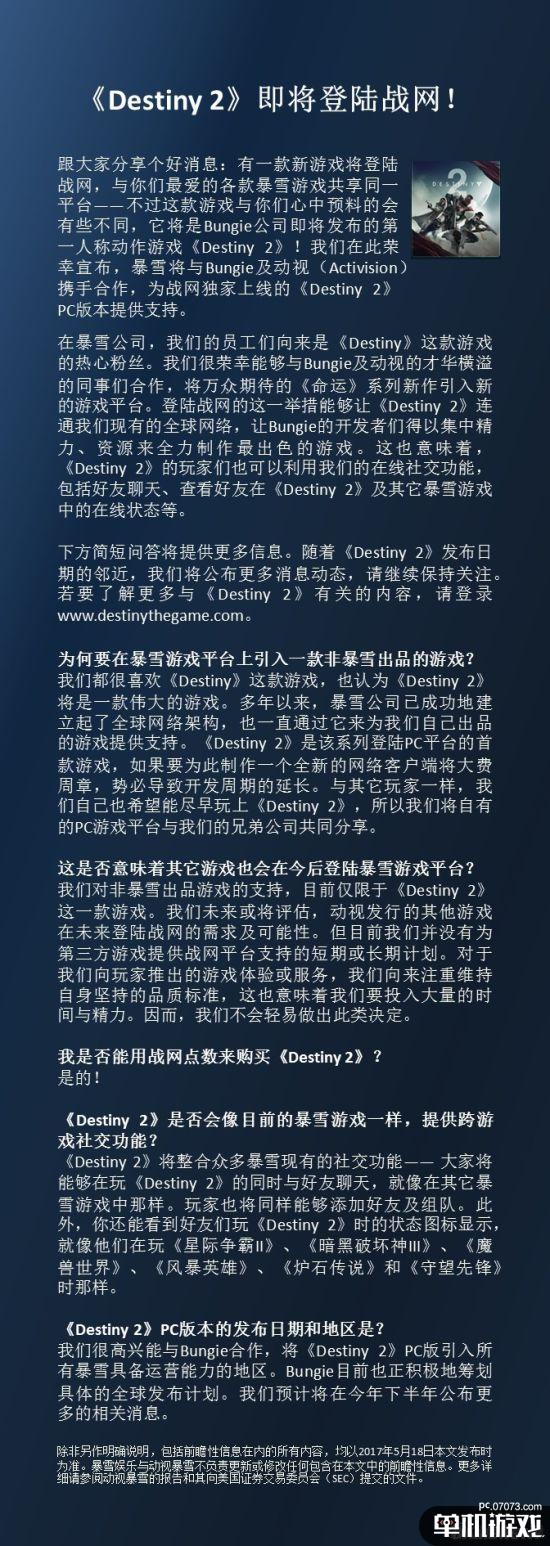 在《命运2》发布会的末尾,暴雪娱乐CEO Mike Morhaime通过视频向大家确认,《命运2》PC版将只会登陆暴雪战网,他表示“这是个很好的机会可以将命运的社区和暴雪的社区结合在一起”。