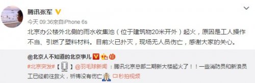 今日,微博网友@我是我_上传了一条视频称“腾讯北京总部二期新大楼处着火”。随后,腾讯公司向中国青年网记者证实,本次事故是北京办公楼外北侧在建中的雨水收集池(位于建筑物20米开外)起火,原因是工人操作不当、引燃了塑料材料。
