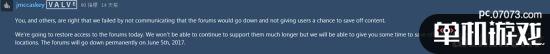 John McCaskey表示Steam玩家论坛(Users' Forums)将会在2017年6月5日正式关闭,对于早先突然关闭论坛而且没有通知玩家进行了致歉,因此他们决定重新开启玩家访问论坛的权限,但并不会开启很久,重新开启是为了让玩家能够有时间保存一些自己觉得论坛上有意义的内容,6月5日起会永久关闭。