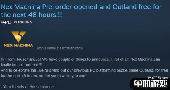 在该游戏商城页面中出现了公告,其公告内容大意是:为了庆祝《Nex Machina》的预售开启(该游戏将于6月20日发售),特举办了《奇异领域》免费领取活动,活动时间为接下里的48小时,点击即可永久拥有。
