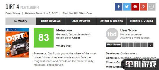 《尘埃4》的媒体评分已经解禁,各家给出的分数普遍不错,普遍认为游戏在玩法上有着很大的创新,无论是对与系列老粉丝还是新玩家来说,都是非常好的游戏。M站目前综合评分为83分。