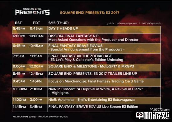 活动第三天,第一场发布会是16日凌晨1点钟的《最终幻想:纷争》的制作人访谈,将谈到粉丝最关心的一些问题,1点45分是《最终幻想:brave exvius》制作人特辑,2点15分是《最终幻想12:黄道年代》的试玩,以及典藏版开箱活动,3点是《摩托GP 17(MotoGP 17)》和《越野摩托3(MXGP3)》发布会,4点45分是《最终幻想》卡牌游戏介绍,5点30分是《尼尔》音乐会精彩集锦,6点钟是《尼尔:机械纪元》特别活动,6点45分是《最终幻想:brave exvius》的E3特别直播。