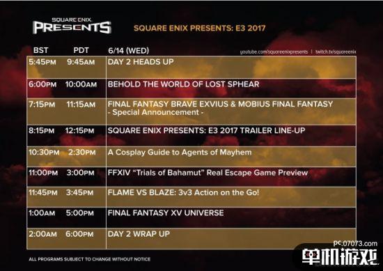 第二天的活动将在北京时间15号零点45分开始,十五分钟预热活动之后是复古风RPG《LOST SPHEAR》发布会,2点15分是衍生手游《MOBIUS最终幻想》和《最终幻想:brave exvius》的发布会,然后是E3预告秀以及《混乱特工》COS秀,然后6点整是《最终幻想14》“巴哈姆特的试炼”前瞻,6点45分是3V3手游《火焰VS烈火(flame vs blaze)》发布会,8点是《最终幻想15宇宙》发布会。